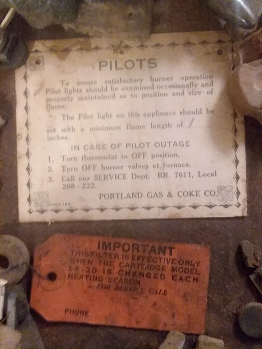 Look for actual signs, remnants of an oil furnace. Tacked or nailed to the walls of support posts in the basement. You may see a heating oil tank fuel pump or filter in a crawl space or basement. Things like fuel filter records or fuel type warnings are good indicators of oil heat.